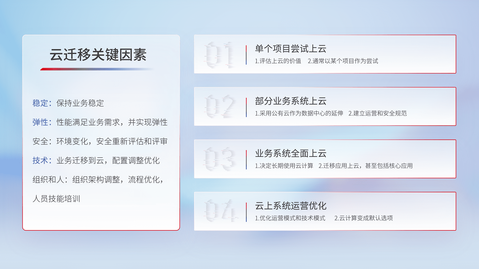 结合实际业务,,从规划设计、、、、云平台选型、、、云原生改造、、、、数据迁移、、集成交付,,迁移全过程为客户识别最佳上云路径,,,做好风险识别管理,,,设计网络架构、、身份权限、、安全审计合规、、、操作审计、、日志审计、、、监控告警策略、、多站点容灾设计等,,,,对云上基础设施进行整体规划,,,提升IT治理水平,,以满足弹性、、、、高可用、、、、高性能的需求。。