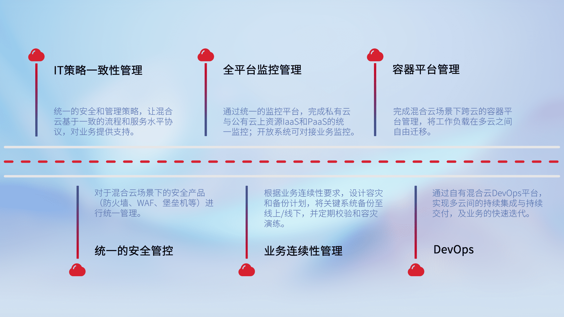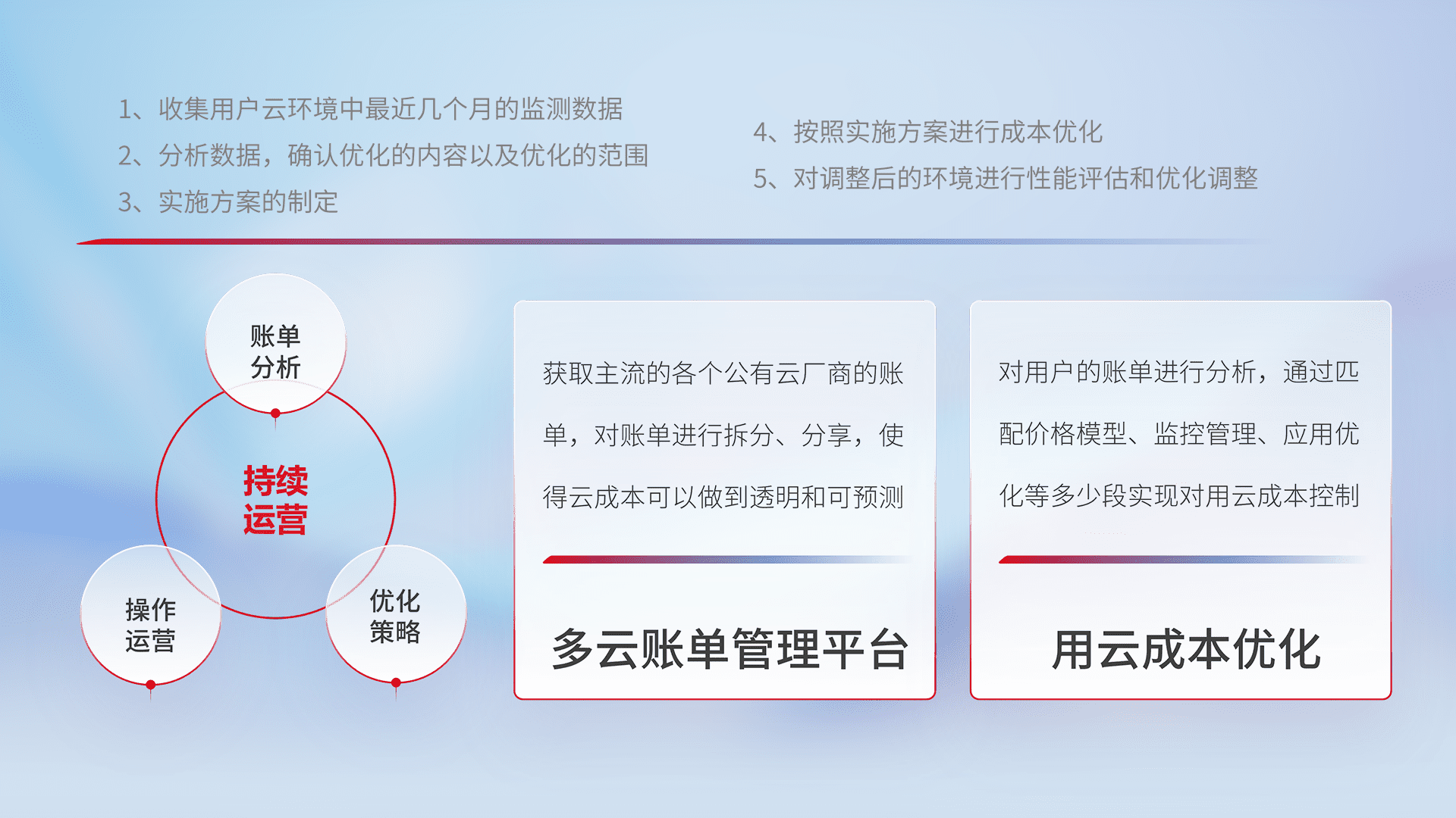 通过多云纳管,,,以统一的资源数据模型把客户的云资源进行抽象和封装,,进而实现对多云资源的统一操作,,,,保障云资源管理的可靠性、、稳定性与可用性。。。量身定制化运维内容,,,配置、、、开发运维、、、补丁管理、、备份、、监控、、、、认证和访问管理、、、、审计和日常巡检等,,保障在用云过程中的可靠度,,稳定度以及高可用率。。。