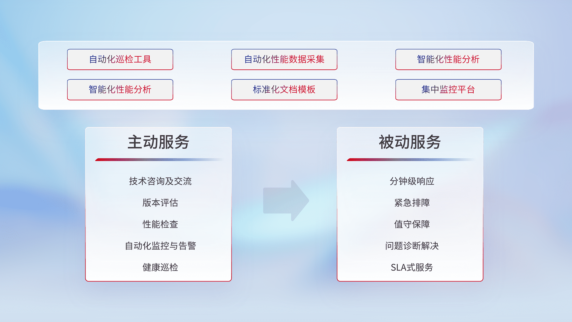 智能化工具和标准化文档,,保障服务质量,,提供主动服务(包含技术咨询、、、版本评估、、、、性能检查、、自动化监控与告警、、、健康巡检)和被动服务包含(分钟级响应、、、、紧急排障、、、、值守保障、、问题诊断解决、、、SLA服务)。。
