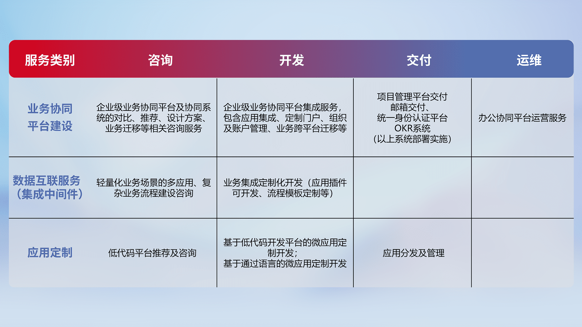 针对钉钉、、企微、、IDaas等平台级产品提供产品的规划、、、、方案、、交付、、、定制化开发等服务,,,实现如统一协同办公、、、、智能客户服务、、、混合会议管理、、、智能数据查询、、、等业务场景,,,实现数字化转型。。